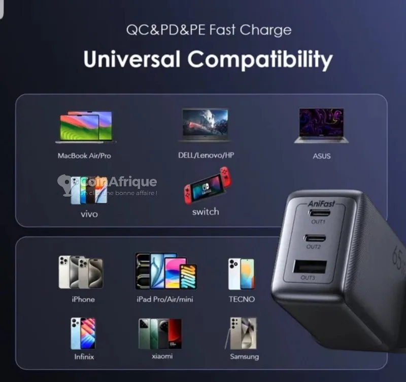 tCharge tout efficacement téléphone macbook ordinateur 65w vitesse réel, multi protection, gan tech prise en charge du rechargement d'un ordinateur portable interrupteur magnétique intelligent texture anti-rayures puissance maximae de 65 w charge à pleine vitesse avec 65 w de puissance maximale, l'oraimo hypergan 65 alimente rapidement vos multiples appareils : chargez l'infinix hot40i à 70 % en 37 minutes chargez l'iphone 15 à 70 % en 30 minutes chargez le macbook pro 14 à 70 % en 75 minutes puce gan de qualité aérospatiale charge plus froide, efficacité améliorée qu'apple samsung, xiaomi, huawei, tecno, infinix, hp, dell etc