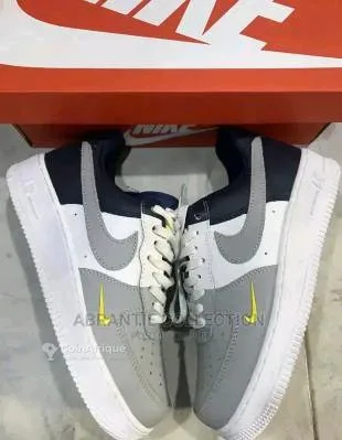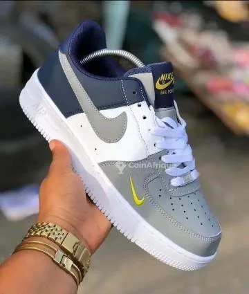 tJe mets en vente une paire de chaussures nike air force 1 originales, design moderne et très propre. couleurs : gris, blanc et noir avec un logo jaune qui donne un style unique ???? ✔️ très confortables ✔️ idéales pour sorties, travail ou quotidien ✔️ semelle solide et durable ✔️ état : neuf prix : 25 000 fcfa (négociable légèrement)