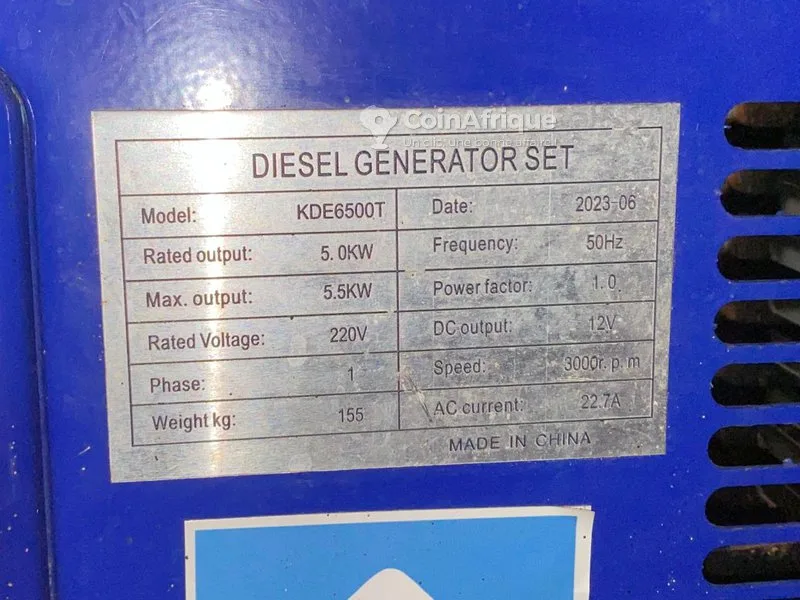 tDiesel generator set model: kde6500t date: 2023-06 rated output: 5.0 kw max output: 5.5 kw rated voltage: 220 v frequency: 50 hz power factor: 1.0 phase: 1 (single phase) dc output: 12 v speed: 3000 r.p.m ac current: 22.7 a weight: 155 kg made in: china