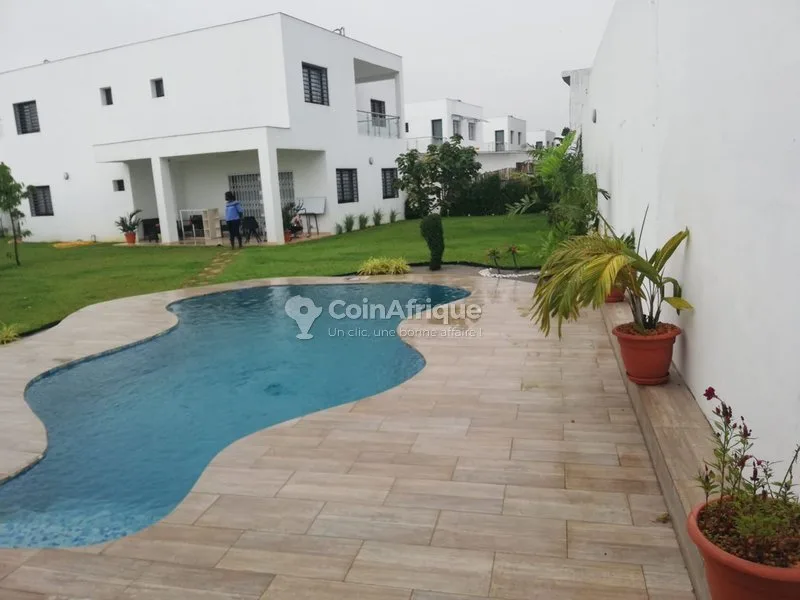 tÀ louer - villa Cocody angré gestoci à louer, une villa duplex de 8 pièces bâtie sur une superficie totale de 800 m2 composé de 05 chambres toutes autonome, 02 séjours, 01 grande cuisinière entièrement équipée d'un frigo américain, une machine à laver, une cuisinière électrique avec four etc. 01 piscine, 01 boyerie avec une grande cour arrière pour le personnel de maison. loyer: 1,800,000 fcfa ref beau/ massa