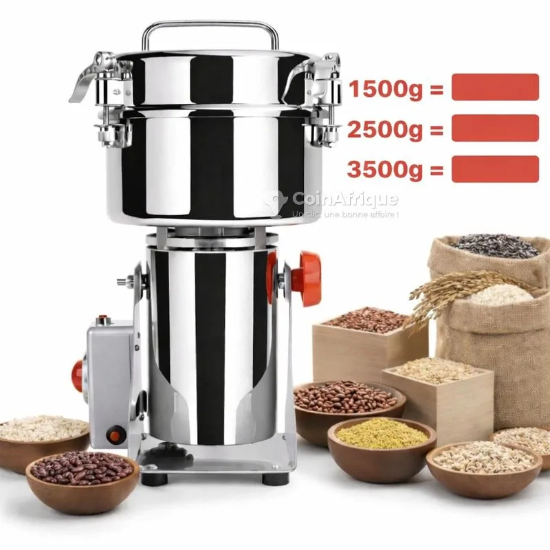 t???????? moulin à grain sec ultra puissant disponible ! ???????? transformez vos céréales en poudre fine en quelques secondes ! ✅ idéal pour maïs, riz, mil, café, arachide, épices, haricot, etc. ✅ moteur très puissant ✅ résultat rapide et professionnel ✅ corps en acier inoxydable résistant ✅ facile à utiliser et à nettoyer ???? disponible en 3 capacités : ???? 1500g = 100.000 f ???? 2500g = 120.000 f ???? 3500g = 140.000 f parfait pour commerce, restaurants, transformation alimentaire ou usage domestique.