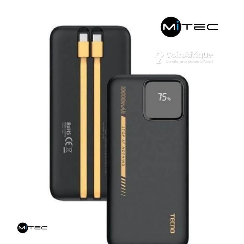tPower bank tecno 10000 mah en promo à mitec ci livraison rapide avec reçu et garantie. caractéristiques : le tecno 10000 mah led display est une batterie externe conçue pour offrir une recharge fiable et rapide de vos appareils au quotidien. compacte et robuste, elle est idéale pour les déplacements, les voyages ou les journées intensives. son écran led permet de visualiser facilement le niveau de batterie restant pour une meilleure gestion de l’énergie. caractéristiques techniques batterie ▪️capacité : 10000 mah ▪️type : batterie lithium ▪️nombre de charges : jusqu’à 2 à 3 charges de smartphone charge et puissance ▪️sortie usb-a : 5v / 2.