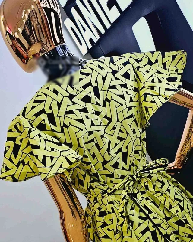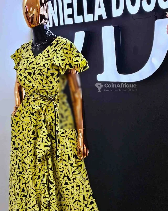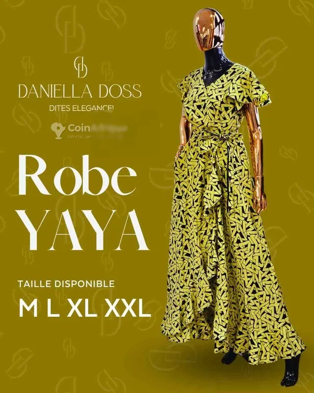 t La magnifique robe yaya, avec son motif vibrant et sa coupe élégante, est parfaite pour toutes vos occasions spéciales. - matière: wax - taille: m, l, xl, xxl - couleur: jaune avec motif noir - prix: 25.000fr la matière wax de haute qualité et ses couleurs éclatantes vous feront briller à chaque instant. célébrez votre beauté et votre élégance avec la robe yaya - livraison possible. - localisation de la boutique: angré djorogobité, non loin du nouveau chu. daniella doss est un marque de vêtements féminins made in côte d'ivoire.