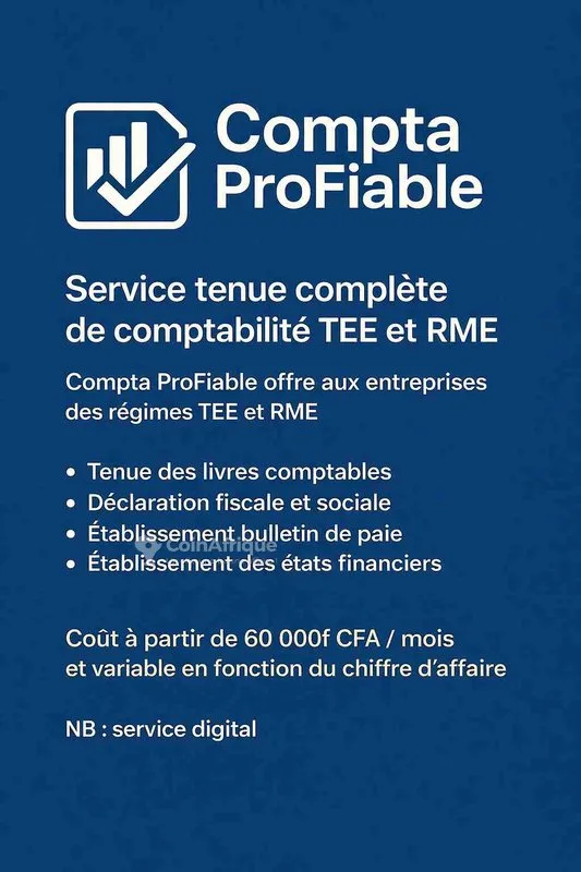 tService tenue complète de comptabilité tee et rme compta profiable offre aux entreprises des régimes tee et rme tenue des livres comptables. déclaration fiscale et sociale. etablissement bulletin de paie. etablissement des états financiers. cout à partir de 60 000f cfa / mois et variable en fonction du chiffre d’affaire. nb : service digital