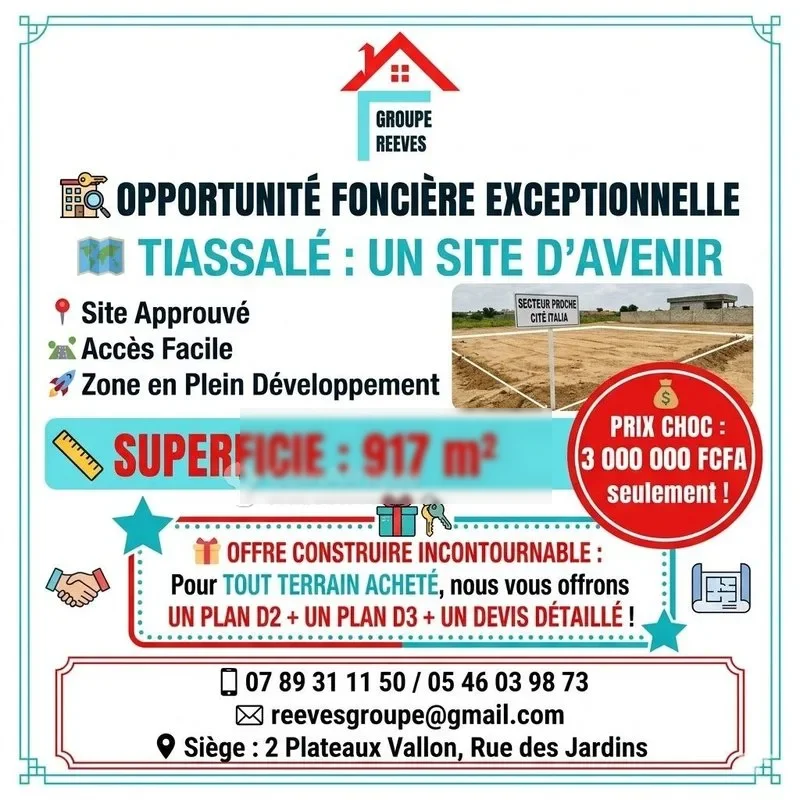 t Situé à tiassalé à proximité immédiate de la cité Italia zone en plein développement accès facile et sécurisé terrain approuvé n'hésitez pas à nous contacter