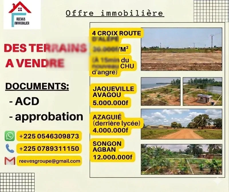 t Situé à cocody angré 12eme tranche à 15mint du nouveau chu d'angré à proximité immédiate de la voie y4 juste après la cité addoha carrefour sally rally zone habité un beau site sécurisé doté d'un acd global disponible, plusieurs lots de 400m2 et 500m2 ,et à songon agban, songon-te, jacqueville avagou jacqueville koko, jacqueville n'djem, ebimpe, azaguie bingerville elokate, n'hésitez pas à nous contacter pour plus de renseignements