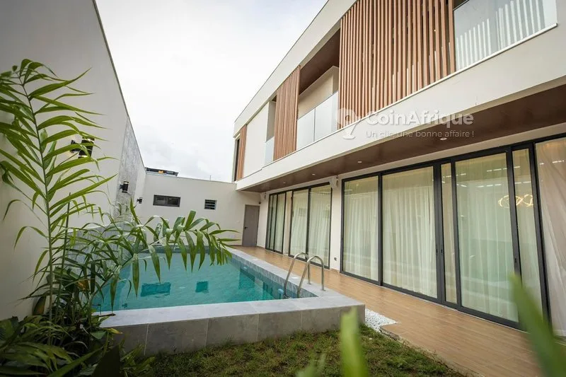 tEn vente 2 grandes magnifique villas duplex de luxe standing, nouvelles construction jamais habité prix 350.millions par villa superficie 350m2 - documents acd villa duplex de 7 pièces 5- grandes chambres autonomes 2- grands salons bien aéré au-rez et 1er étage 2- grands cuisines aux lignes épaurées, toutes équipées 1- buanderie 1- garage de 2 voitures 1- piscine privative et petit jardin 1- patio paysager situé à cocody faya ab seinter