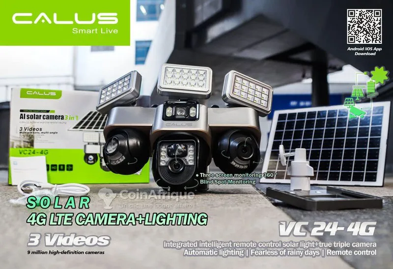 tCaméra solaire callus vc24-4g ai (ptz 3-en-1) : la caméra solaire callus vc24-4g ai est une solution de sécurité extérieure tout-en-un performante, conçue pour les zones sans wi-fi ni électricité. alimentée par un panneau solaire à haut rendement et fonctionnant en 4g lte, cette caméra assure une surveillance continue et fiable où que vous soyez. dotée d'un système 3-en-1, elle combine plusieurs objectifs pour une couverture étendue et une image plus nette, réduisant ainsi les angles morts autour de votre propriété. la fonction ptz (panoramique-inclinaison-zoom) permet de contrôler à distance les mouvements de la caméra, offrant une surveilla