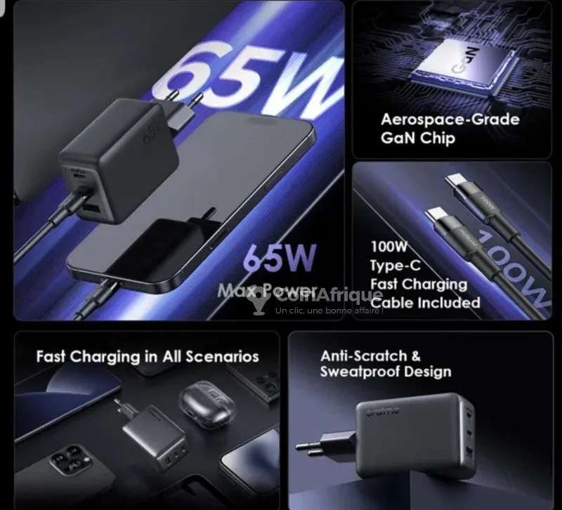 tCharge tout efficacement téléphone macbook ordinateur 65w vitesse réel, multi protection, gan tech prise en charge du rechargement d'un ordinateur portable interrupteur magnétique intelligent texture anti-rayures puissance maximae de 65 w charge à pleine vitesse avec 65 w de puissance maximale, l'oraimo hypergan 65 alimente rapidement vos multiples appareils : chargez l'infinix hot40i à 70 % en 37 minutes chargez l'iphone 15 à 70 % en 30 minutes chargez le macbook pro 14 à 70 % en 75 minutes puce gan de qualité aérospatiale charge plus froide, efficacité améliorée qu'apple samsung, xiaomi, huawei, tecno, infinix, hp, dell etc