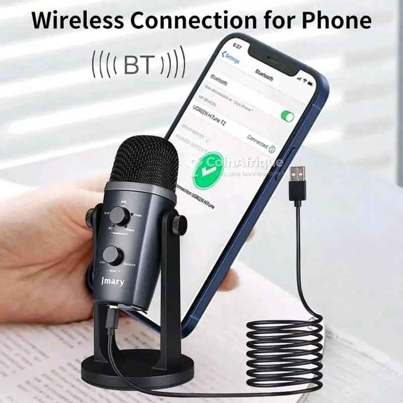 tL'image représente le microphone usb professionnel jmary mc-pw10. il s'agit d'un microphone à condensateur usb polyvalent, idéal pour les enregistrements audio sur ordinateur, le podcasting, les jeux, le streaming et les appels vidéo. il offre une qualité audio professionnelle grâce à sa capsule à condensateur de haute qualité et son motif polaire cardioïde, qui réduit les bruits de fond indésirables. il est compatible avec windows, macos et les appareils de type c (avec un adaptateur si nécessaire), offrant une fonctionnalité plug-and-play. le microphone est équipé d'une prise casque de 3,5 mm pour une surveillance en temps réel et sans