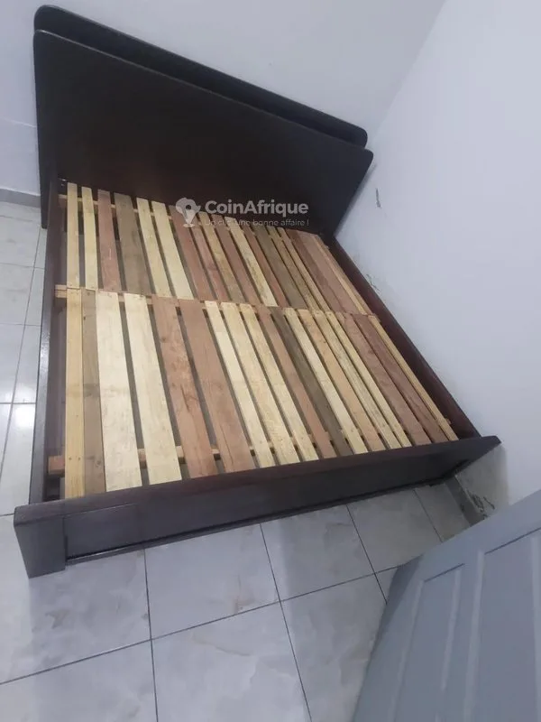 tLit 3 places avec tête de lit et étagère couleur noir laqué sommier à lattes bois 200×190 (3 places) état neuf