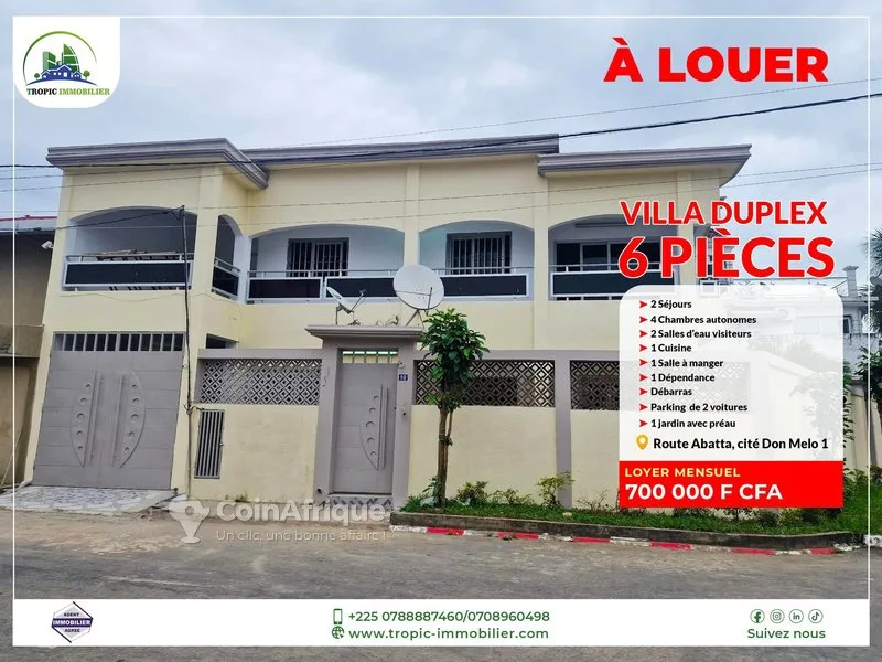 t???????????? à louer – une villa duplex 6 pièces + dépendance située à la cité don melo 1, route d’abatta, cette belle villa duplex en pleine rénovation sera disponible dans quelques jours. ???? composantes : ????️ 2 séjours ????️ 4 chambres autonomes ???? 2 salles d’eau visiteurs ????️ 1 cuisine ???? 1 salle à manger ???? 1 dépendance ???? débarras ???? parking pour 2 voitures ???? 1 jardin avec préau ????️ balcons ✅ réservez dès maintenant pour ne pas manquer cette opportunité ! ???? loyer mensuel : 700 000 f cfa visite sur rdv : lion immobilier????