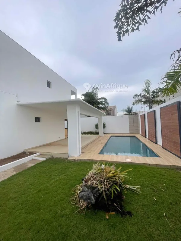 tÀ louer - villa cocody angré gestoci à louer, une villa duplex de 8 pièces bâtie sur une superficie totale de 500m2 composé de 05 chambres toutes autonome, 02 séjours, 01 grande cuisinière entièrement équipée d'un frigo américain, une machine à laver, une cuisinière électrique avec four etc. 01 piscine, 01 boyerie avec une grande cour arrière pour le personnel de maison. loyer: 1 500 000 fcfa
