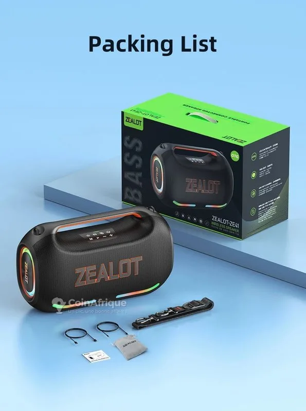 tZealot ze41 – enceinte bluetooth ultra puissante 190.000f • puissance sonore 250w avec basses profondes et effet surround 3d • batterie 48.000 mah pour une autonomie jusqu’à 48h • application dédiée pour contrôler l’égaliseur et les effets sonores • fonction power bank pour recharger vos appareils • bluetooth 5.3 / 5.4 + fonction tws (connexion de deux enceintes) • éclairage led rgb pour une ambiance festive • mode karaoké pour chanter avec vos amis • étanchéité ipx6, idéale pour les fêtes et activités en extérieur une enceinte puissante, autonome et parfaite pour toutes vos ambiances.
